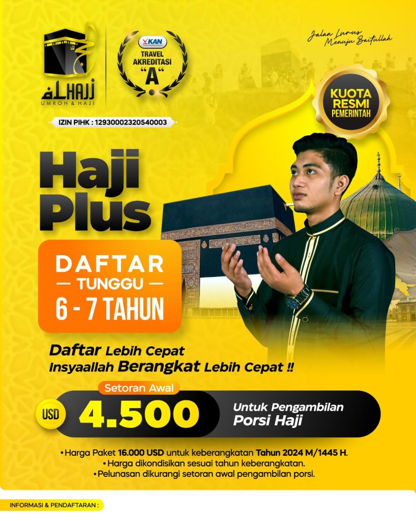 Program haji plus dengan kouta resmi dari pemerintah Indonesia dan tanpa perlu menunggu lama selama puluahan tahun untuk berangkat. Silahkan hubungi kami untuk informasi lengkapnya.