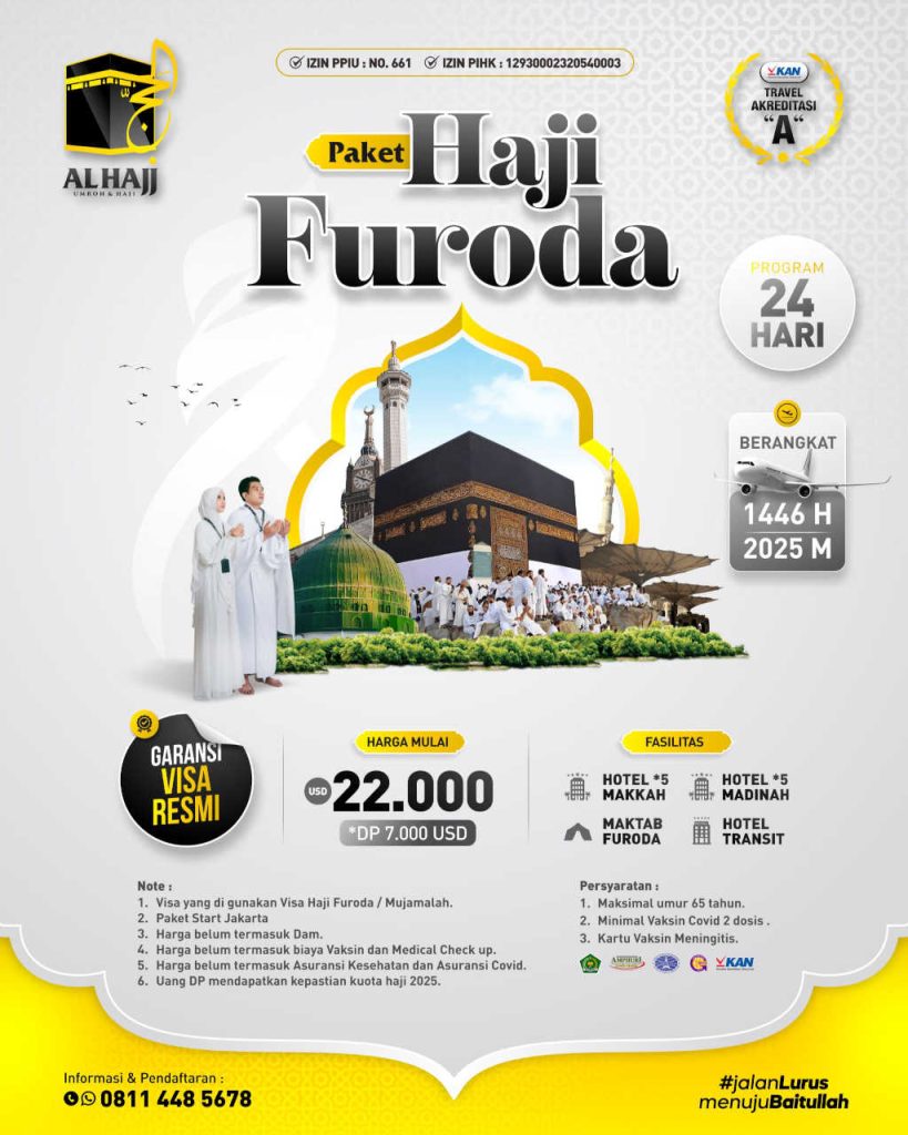 AlHajj menyediakan paket haji Furoda pemberangkatan tahun 2025 dengan program selama 24 hari. Paket dengan fasilitas hotel bintang 5 (Makkah, Madinah, dan hotel transit), serta Maktab Furoda.