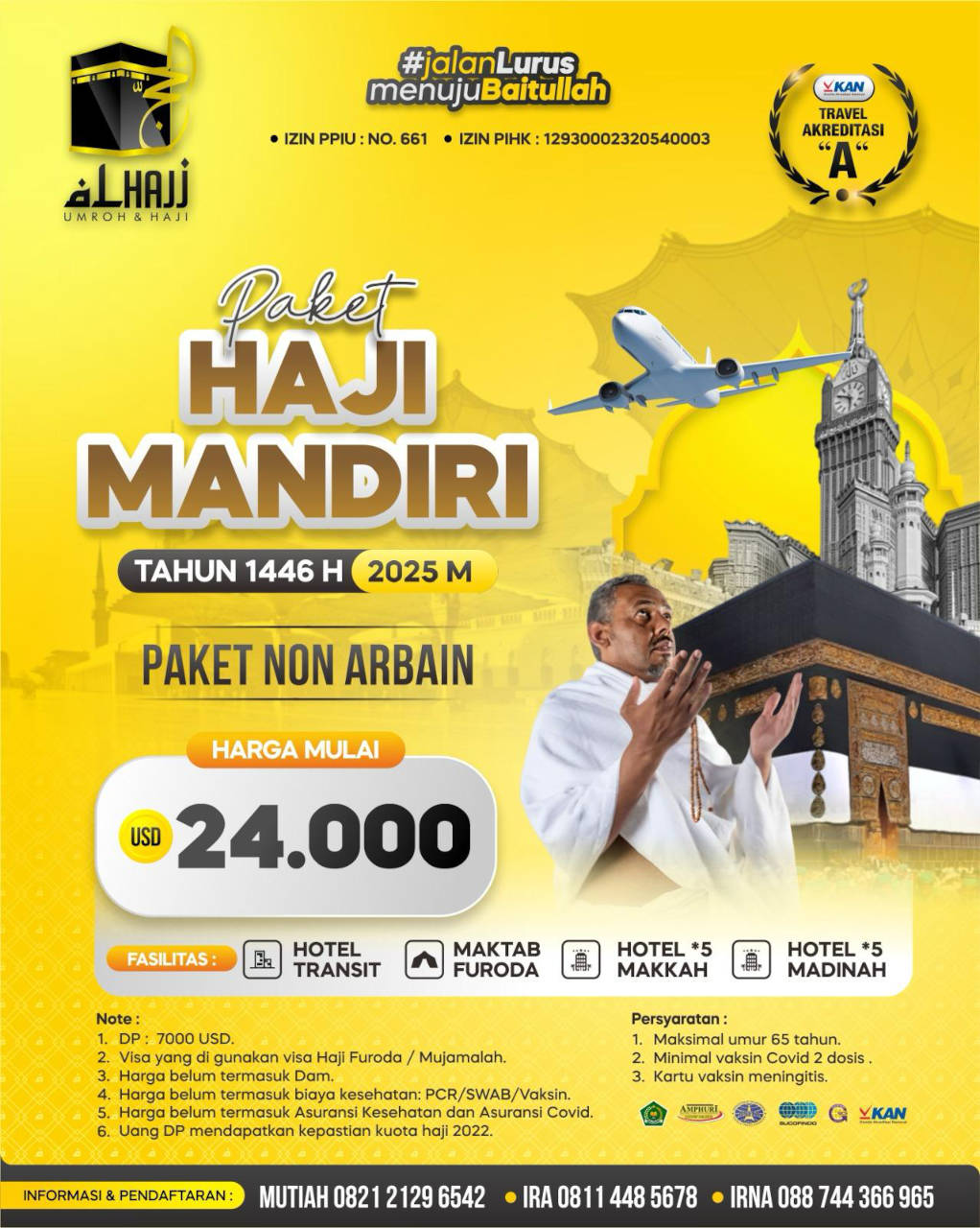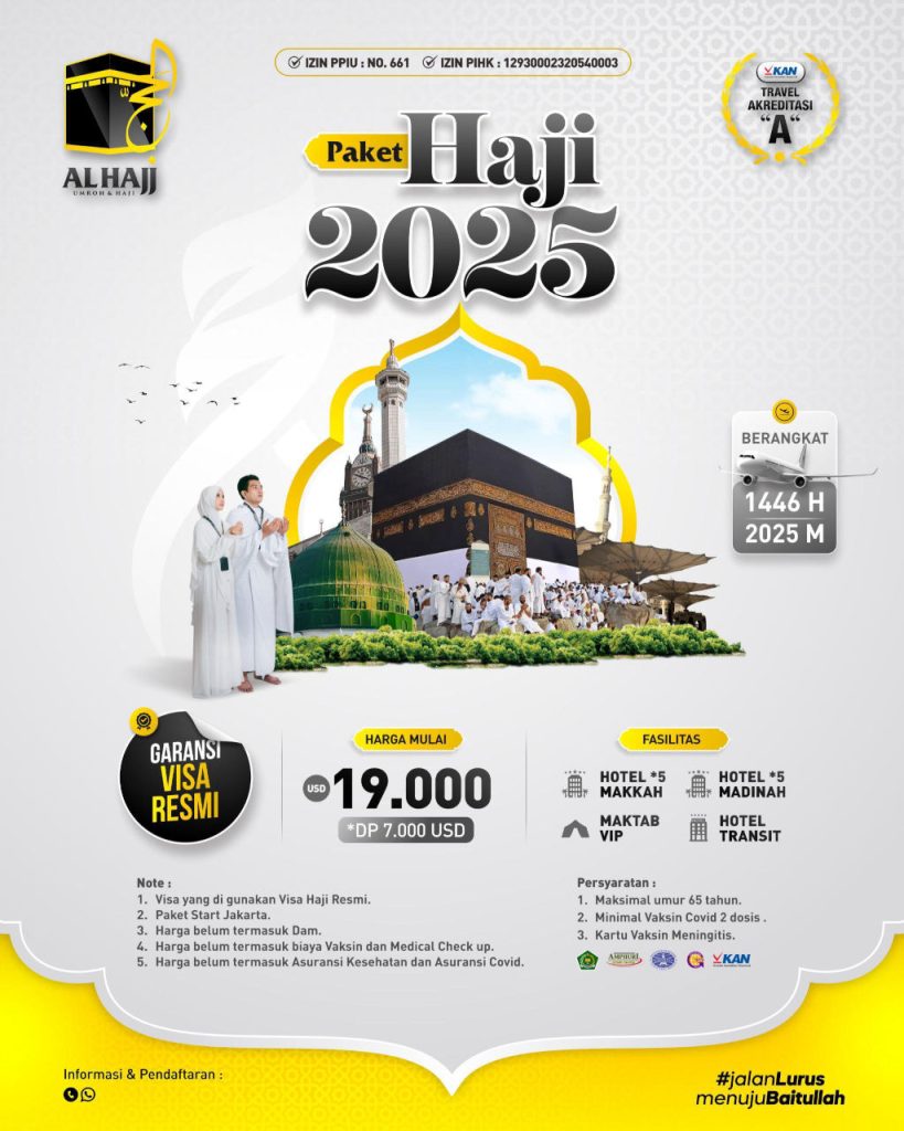 Dapatkan paket haji mandiri dari Al Hajj travel dengan jadwal pemberangkatan tahun 2025. Harga paket mulai USD 24.000 (paket non-Arbain) dan fasilitas premium di kelasnya.