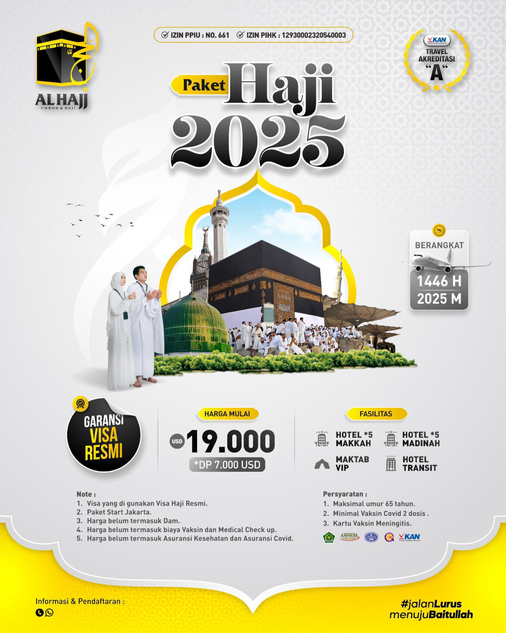 Paket haji 2025 dari AlHajj dengan pemberangkatan tahun 2025 menggunakan Visa haji resmi dari pemerintah. Dapatkan juga fasilitas hotel berbintang di Makkah dan Madinah serta Maktab dengan kelas VIP.
